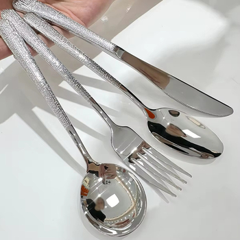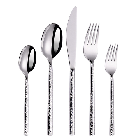Juego de cubiertos clásicos de acero inoxidable pesado con mango redondo grueso martillado de metal ecológico para bodas y fiestas