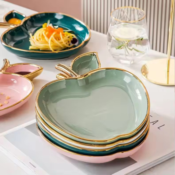 Nuevas ideas de productos, plato de porcelana verde de estilo nórdico ligero de lujo, vajilla, platos de borde dorado rosa, plato de cerámica con forma de manzana