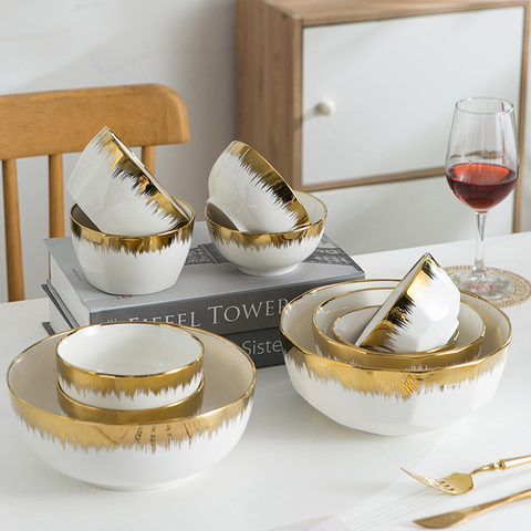 ชามเซรามิกขอบทองแบบนอร์ดิกสำหรับใช้ในครัวเรือนทุกวันร้านอาหารชามข้าวก๋วยเตี๋ยวสลัดหรูหราสีทอง